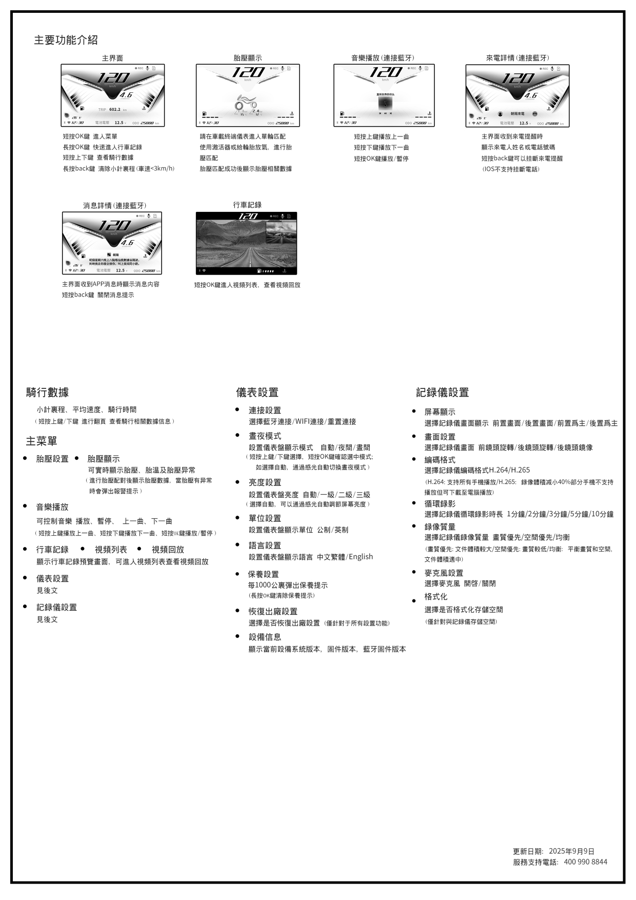 在智能互聯方面,用戶可透過藍牙或 WIFI 與 APP 進行連接 。連接後,儀表可同步顯示手機訊息內容、來電提醒,並支持在騎行過程中直接進行音樂播放控制(上一曲、下一曲、播放/暫停) 。此外,該設備內建強大的行車記錄功能,支持 H.264/H.265 編碼與循環錄影,騎士可隨時切換前、後置攝像頭畫面,並在儀表上直接查看視頻回放